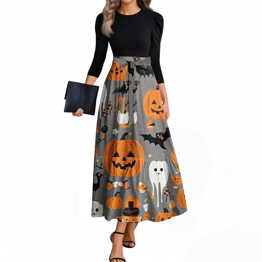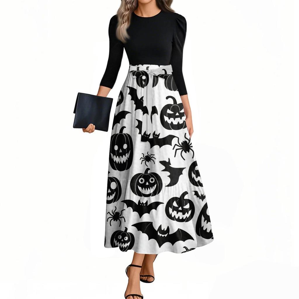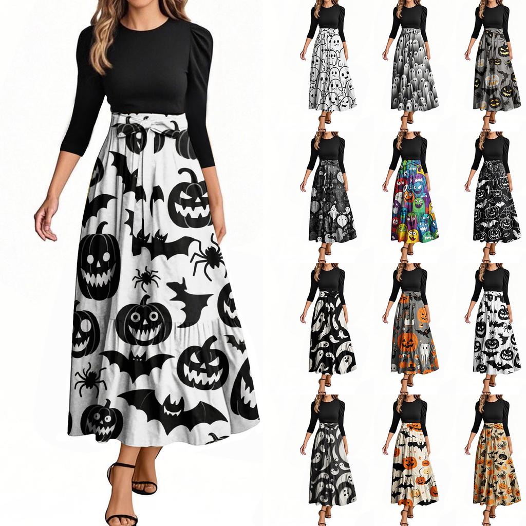 Женские модные повседневные платья с поясом, рукавом три четверти, круглым вырезом, с принтом на Хэллоуин, элегантные, с темпераментом