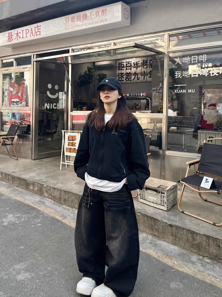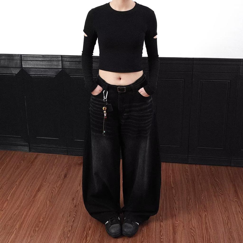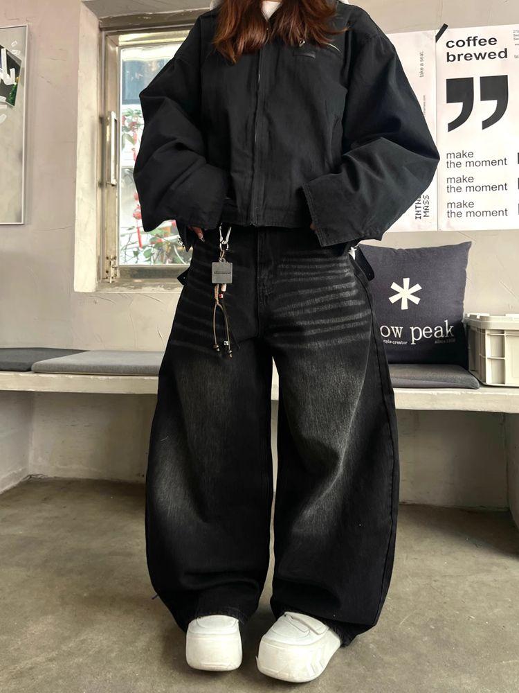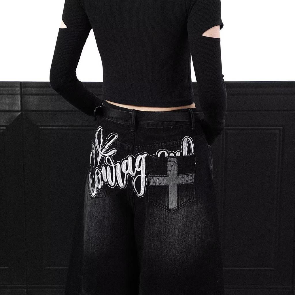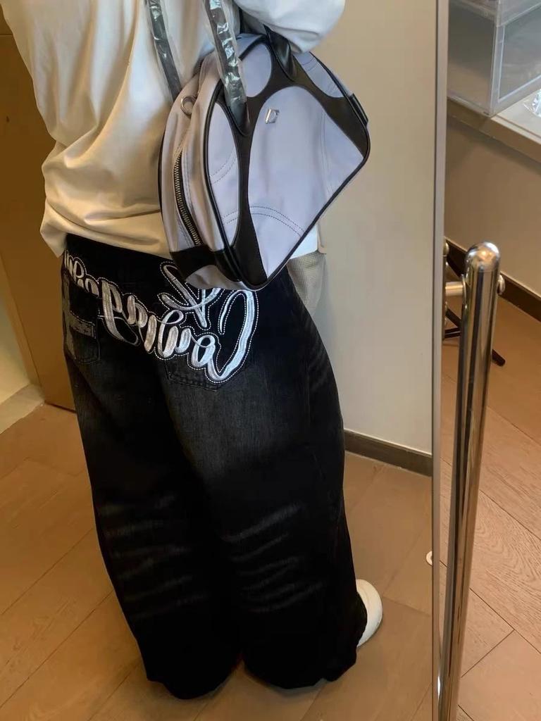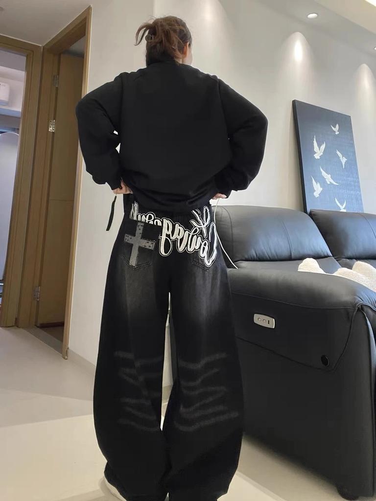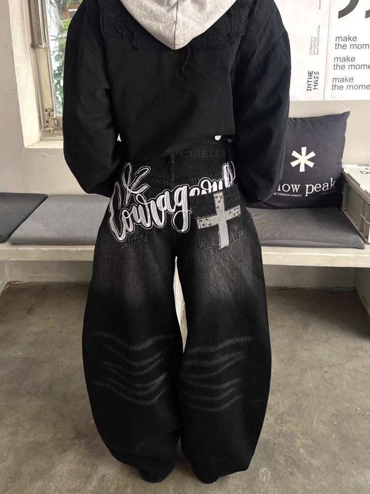 ZYLLO Y2k Винтажные Джинсы с Вышивкой Черными Буквами, Потертые, Харадзюку, Широкие, Американский Ретро, Деним Сабля, Мешковатые, Повседневные