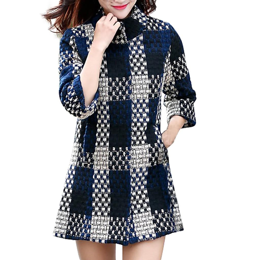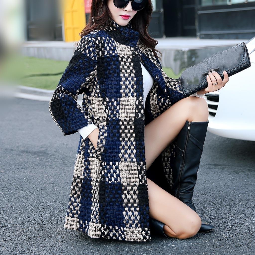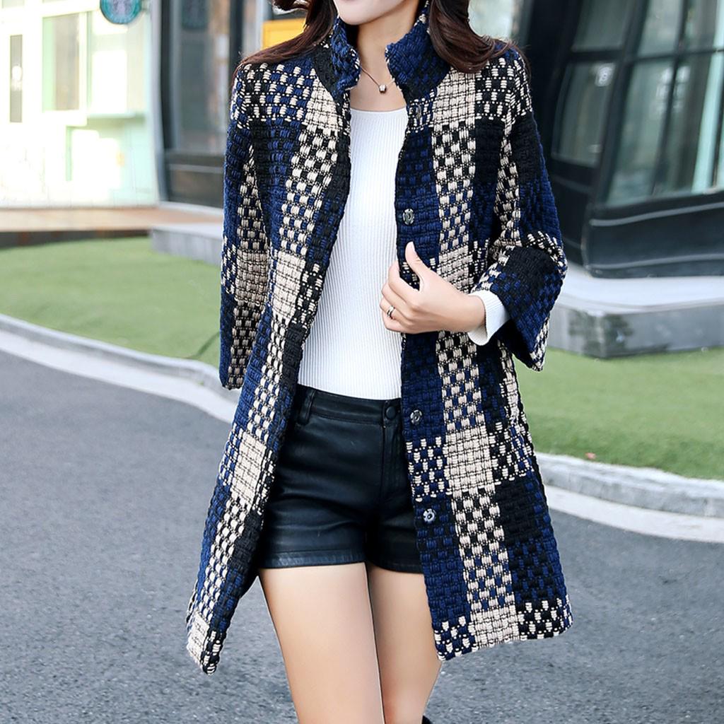 Модная женская зимняя клетчатая шерстяная длинная теплая куртка-пальто на пуговицах