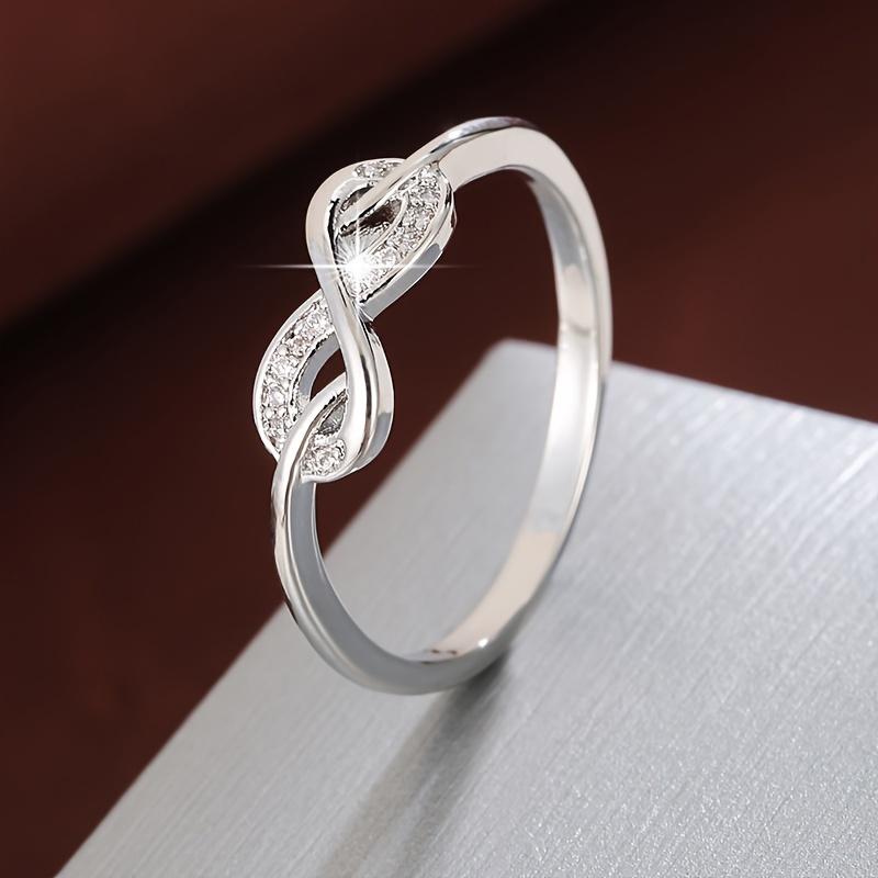 Трендовое кольцо, выполненное в форме восьмерки с инкрустацией циркониями. Подходит для женщин