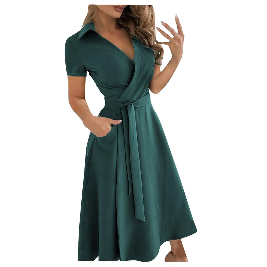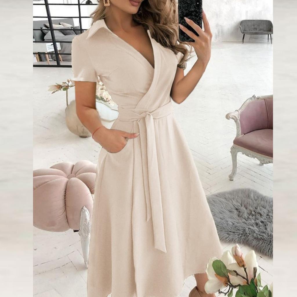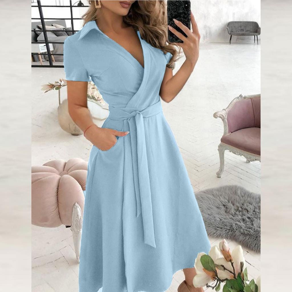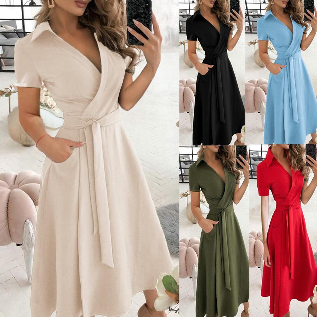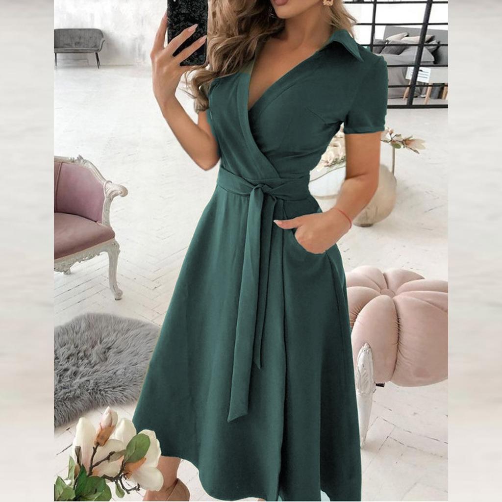Модные женские повседневные однотонные платья с короткими рукавами и лацканами, длинные