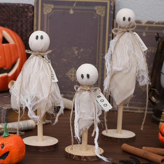 Добавьте жутковатый штрих в ваш хэллоуинский декор с этими очаровательными хэллоуинскими призрачными украшениями.. Этот набор включает три деревянных призрачных украшения разных размеров, идеально подходящих для добавления призрачной атмосферы вашему обеденному столу, полкам, каминной полке или многоярусным подносам.. Каждый призрак тщательно изготовлен с натуральным деревянным основанием и мягкой текстурированной тканью, создавая причудливый парящий эффект.
