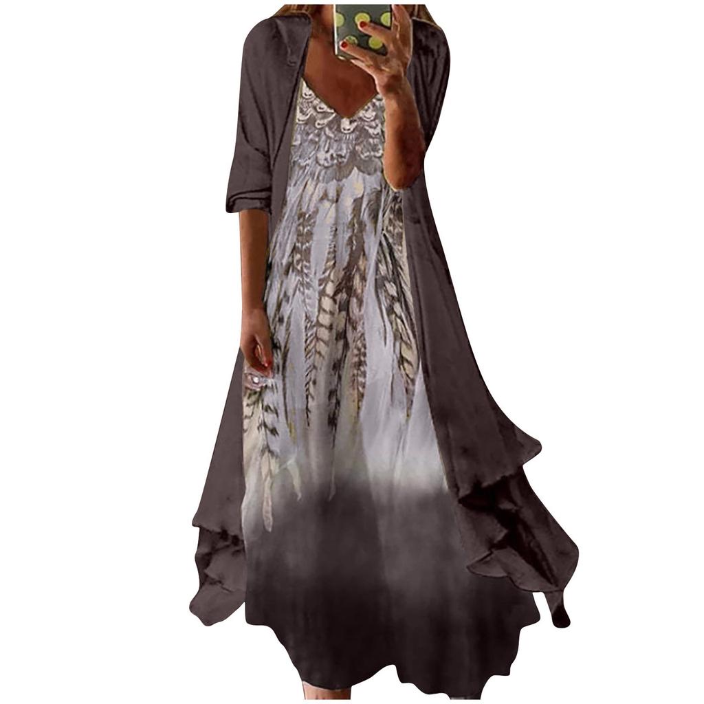Женское летнее повседневное модное шифоновое пальто с V-образным вырезом и принтом, состоящее из двух частей, платье из брезента