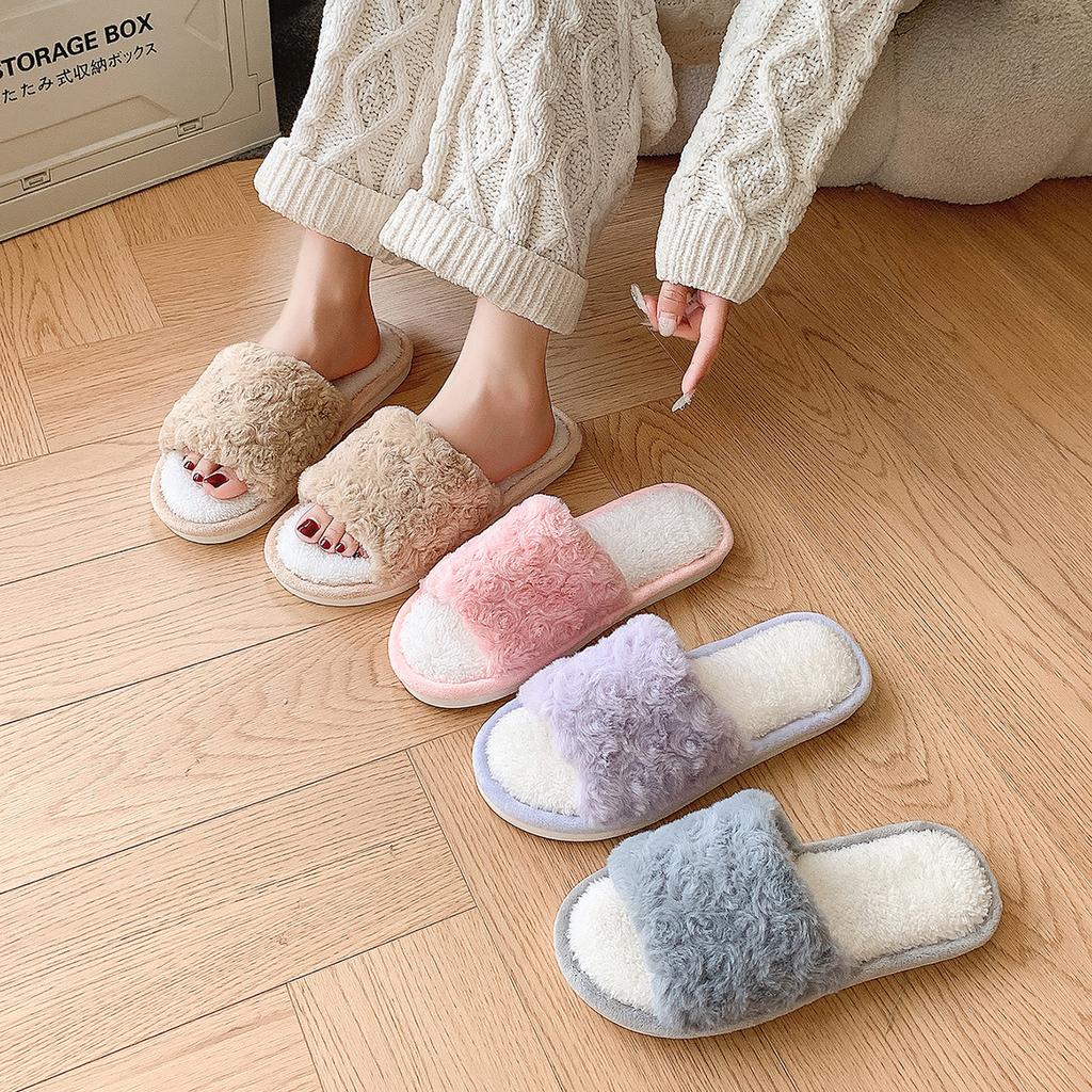 Розовые флисовые открытые хлопковые тапочки Зимние домашние пушистые тапочки Теплый флис Нескользящая толстая подошва Хлопковый моп Универсальные