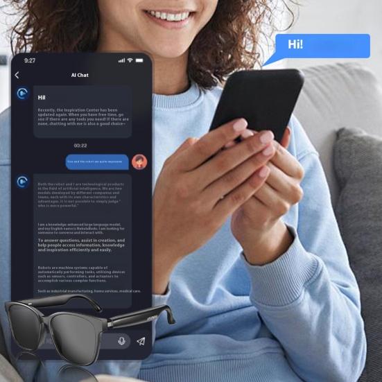 Почувствуйте будущее с умными очками с искусственным интеллектом, предлагающими 9 часов работы от батареи без остановки для непрерывного прослушивания аудио, звонков и перевода.. Оставайтесь на связи благодаря технологии Bluetooth 5.4, обеспечивающей сверхбыстрое подключение и четкие звонки.