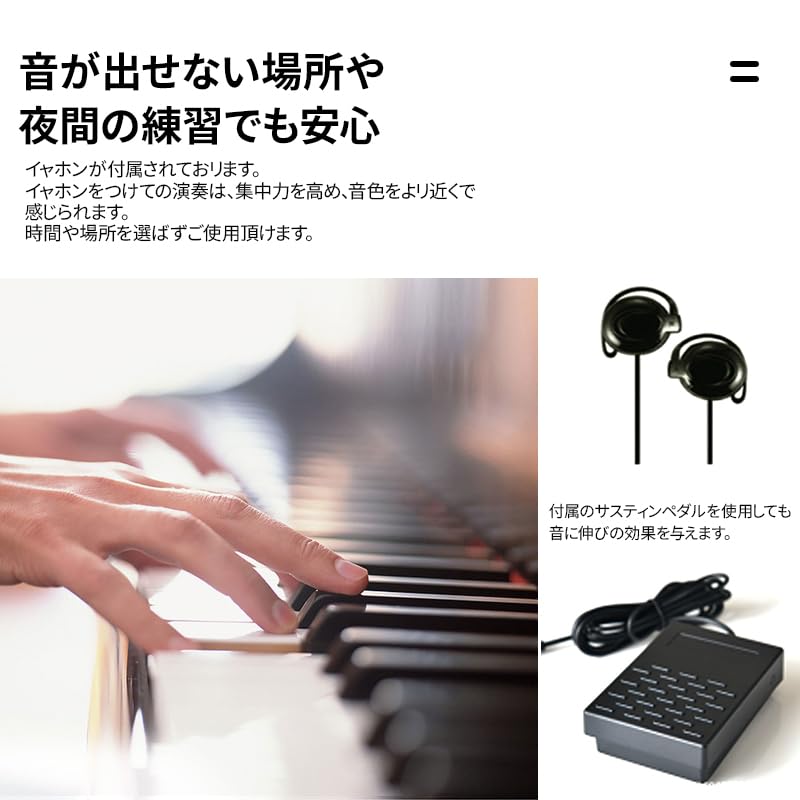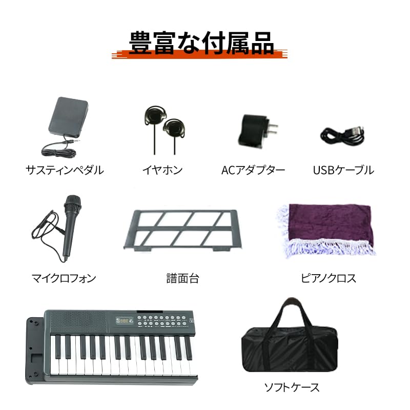 [Простое управление и обширные аксессуары] В дополнение к основному блоку в комплект входят адаптер переменного тока, USB-кабель, пюпитр, педаль сустейна, мягкий чехол для хранения, салфетка для пианино, наушники, микрофон и руководство по эксплуатации на японском языке. Этот исчерпывающий набор аксессуаров включает в себя все необходимое для игры и переноски, удовлетворяя потребности всех, от начинающих до опытных игроков.