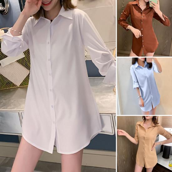 Элегантность сплошного цвета: Наслаждайтесь простотой и изысканностью этой женской рубашки средней длины, которая идеально подойдет для разных случаев.