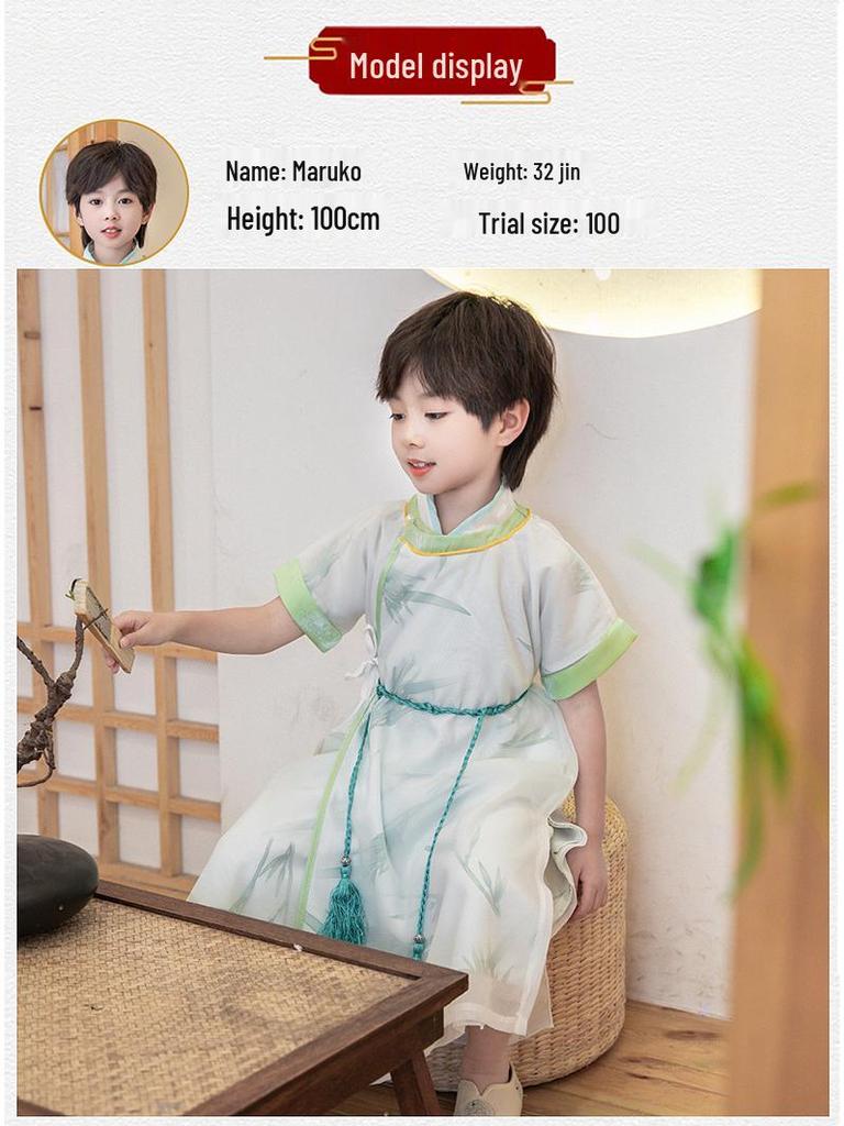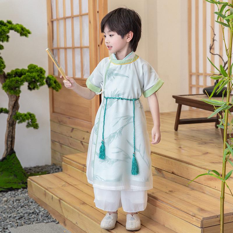 Летний новый детский бамбуковый комплект ханфу 2025: Халат с коротким рукавом в древнекитайском стиле для мальчиков.