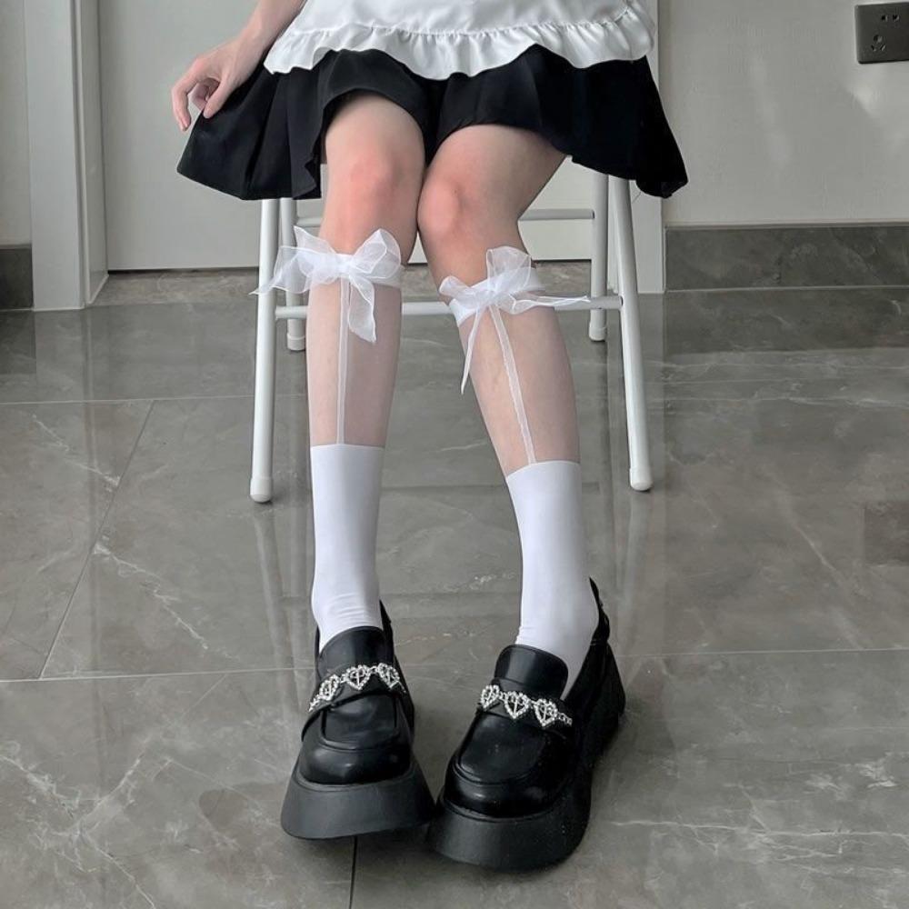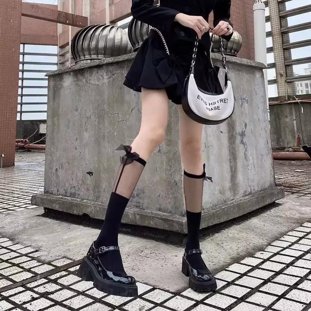 Прозрачные гольфы с бантиком, гольфы средней длины, милые гольфы до колена в стиле JK, тонкие чулки для девочек
