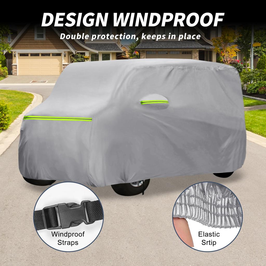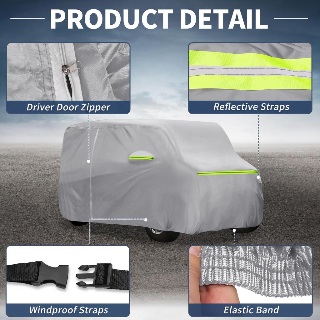 Высокопроизводительный дизайн: Светоотражающая предупреждающая полоса флуоресцентного зеленого цвета снижает риск столкновений при парковке в ночное время.. Молния на двери водителя обеспечивает легкий доступ без снятия чехла. Ветроустойчивые ремни лобового стекла и эластичный низ надежно фиксируют чехол на автомобиле, предотвращая его соскальзывание даже при сильном ветре.