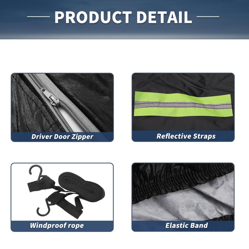 [Защита от сильного ветра] 1. Оснащенный ветрозащитными ремнями спереди и сзади, он менее подвержен сдуванию даже во время тайфунов! 2. Оснащенный ветрозащитными ремнями спереди и сзади, он меньше подвержен воздействию ветра! 3. Превосходные водонепроницаемые свойства защищают ваш автомобиль и позволяют вам спокойно им пользоваться.