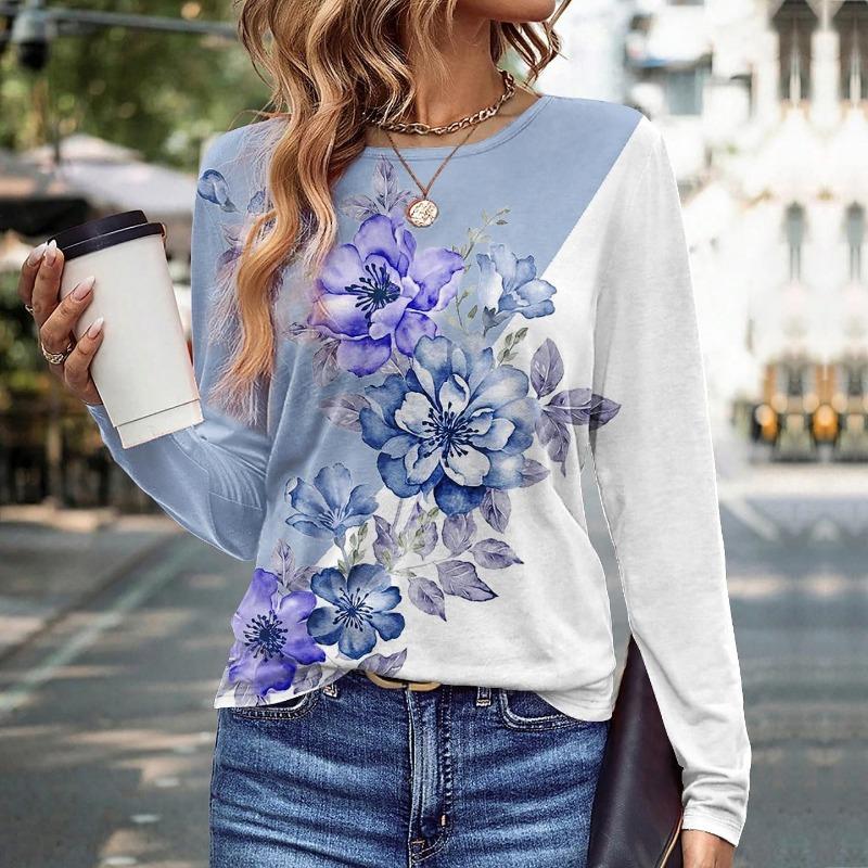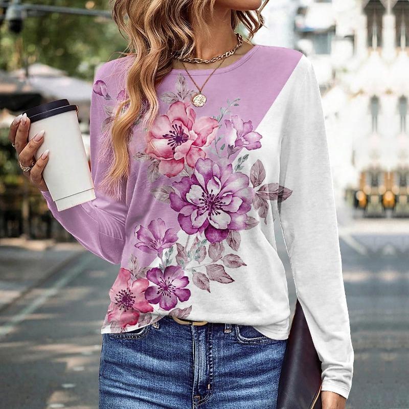 Женская одежда больших размеров Футболки с цветочным узором Весна Осень Длинный рукав 3D-печать Цветочный уличный стиль Женские повседневные топы