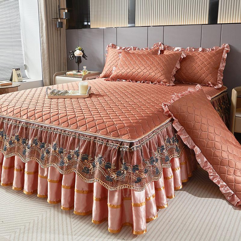 Комплект из 3 предметов для спальни Высококачественная юбка для кровати из хрустального бархата Комплект из трех предметов с толстой кружевной отделкой, стиль корейской принцессы Теплый и нескользящий чехол для матраса