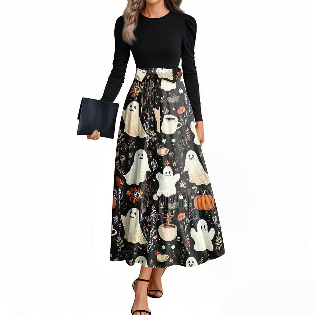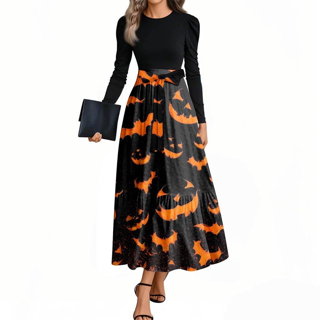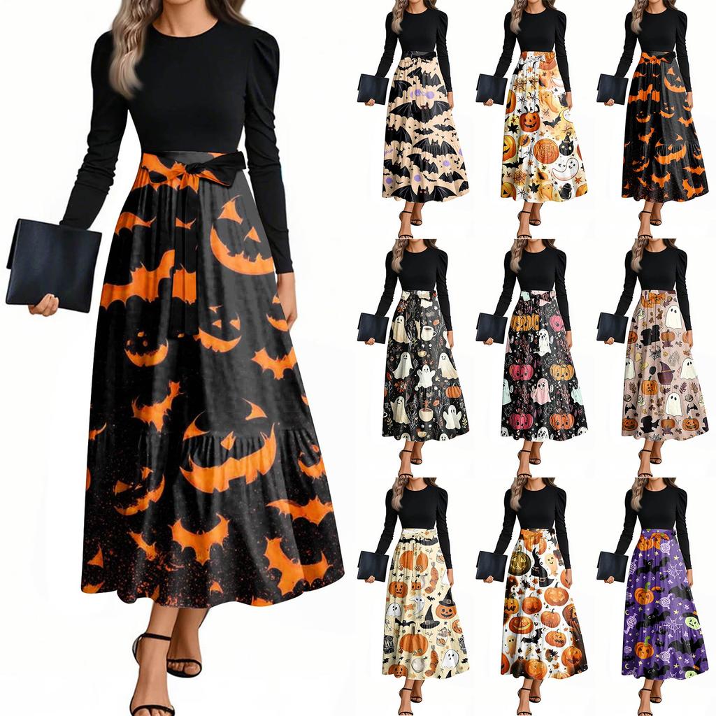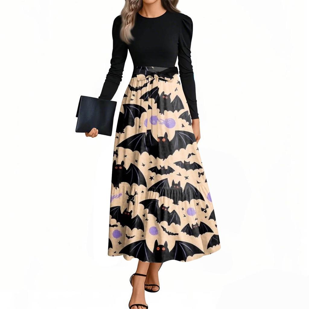 Женские модные повседневные платья с поясом, с длинным рукавом, с круглым вырезом, с принтом на Хэллоуин, элегантные, с темпераментом