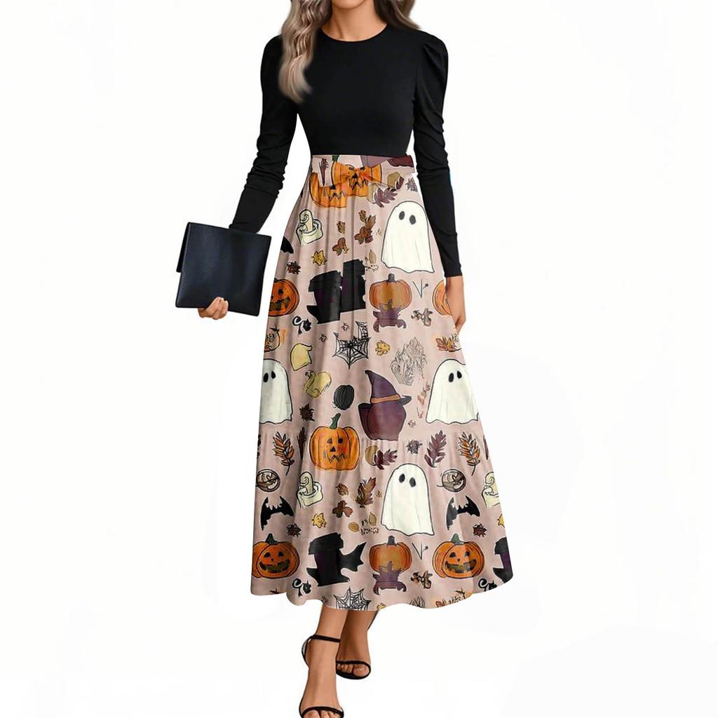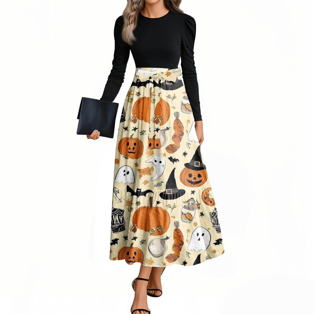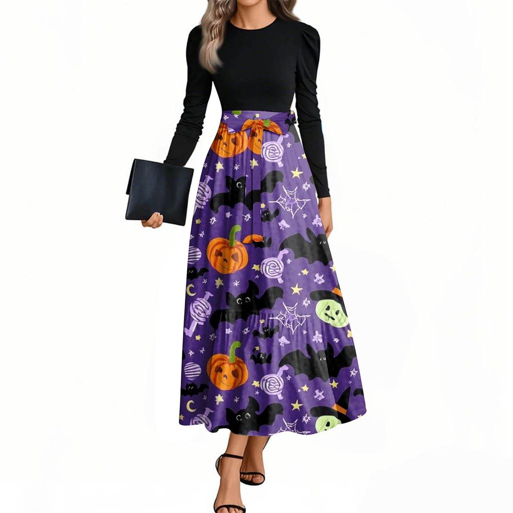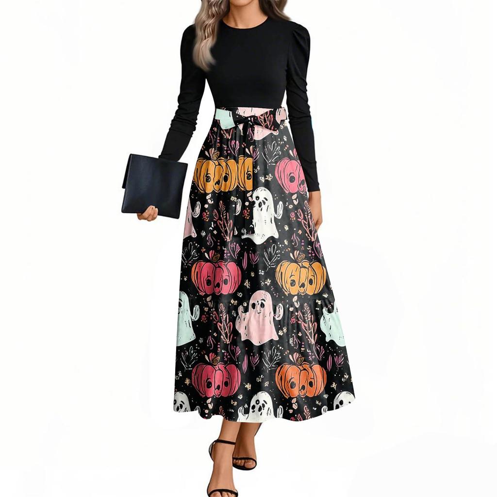 Женские модные повседневные платья с поясом, с длинным рукавом, с круглым вырезом, с принтом на Хэллоуин, элегантные, с темпераментом