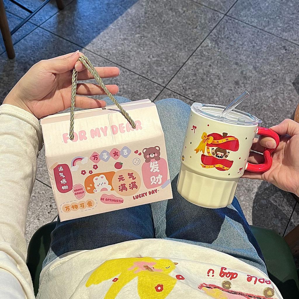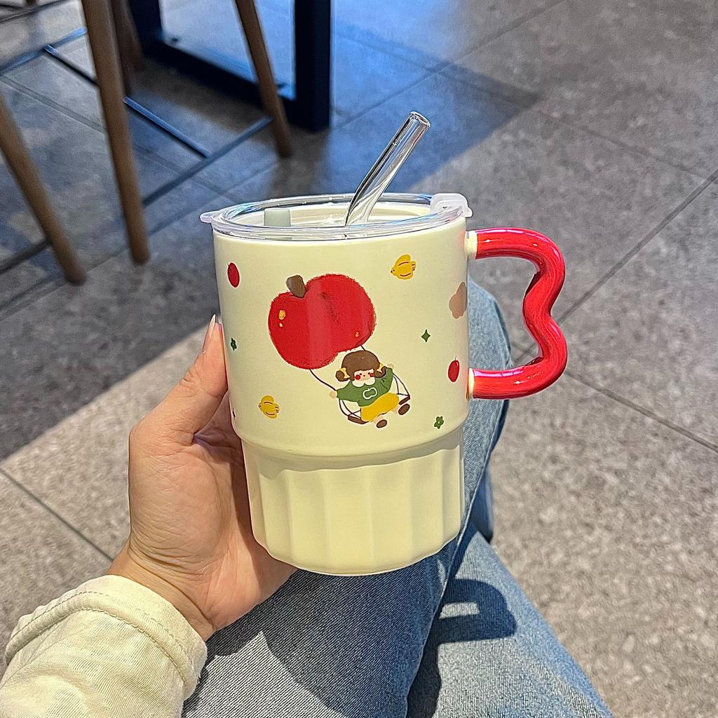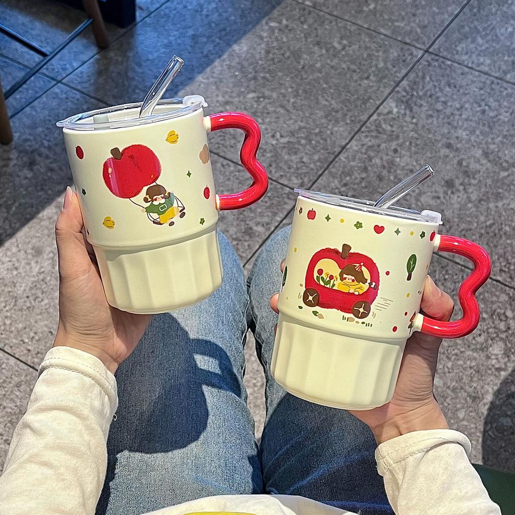 Кружка Apple Girl с крышкой и соломинкой, милая, высококачественная керамическая чашка для воды, бытовая чашка для кофе и сока
