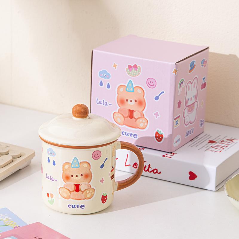 Милая кружка с медведем и крышкой, мультяшная бытовая чашка для воды, керамическая, с высоким внешним видом, чашка для завтрака, подарок на день рождения, сувенир
