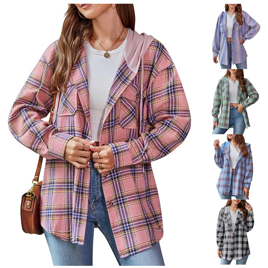 Куртка для женщин, рубашка с капюшоном и шнурком, рубашка с клетчатым принтом, куртка, пальто на пуговицах с длинными рукавами