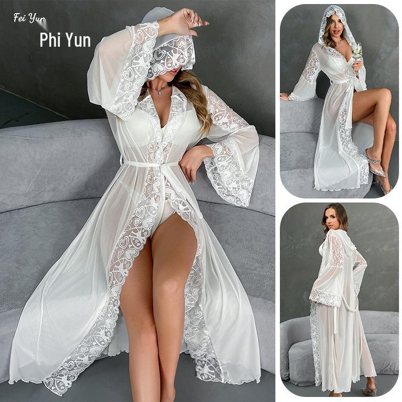 Сексуальный сетчатый халат с капюшоном и кружевной отделкой, нижнее белье с поясом