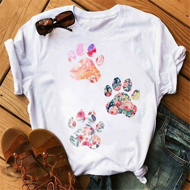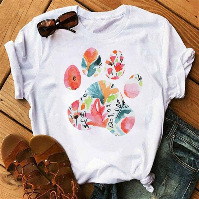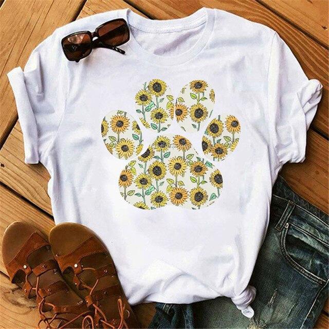 Повседневная футболка с графикой цветов и отпечатков лап собаки для женщин, летняя блузка 90-х с короткими рукавами, свободные футболки, женские топы, детская одежда