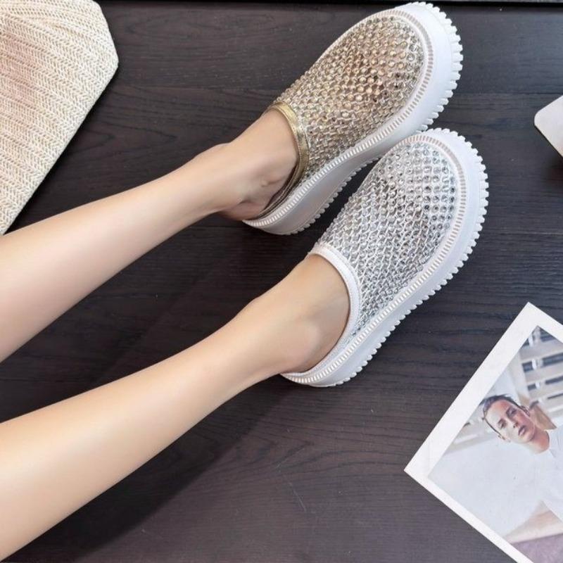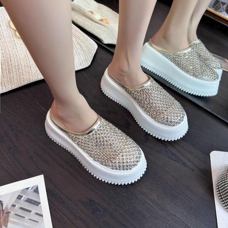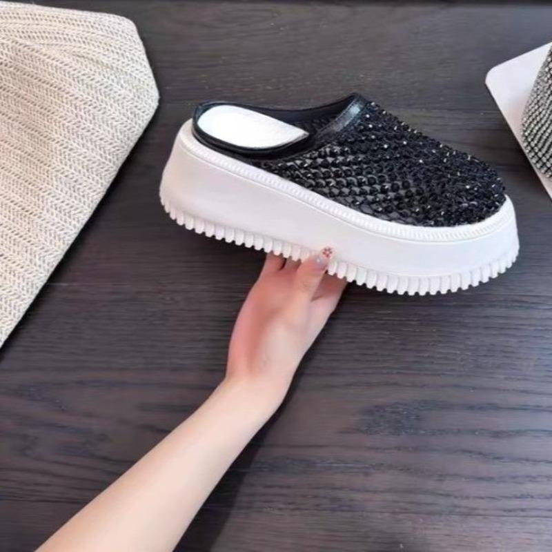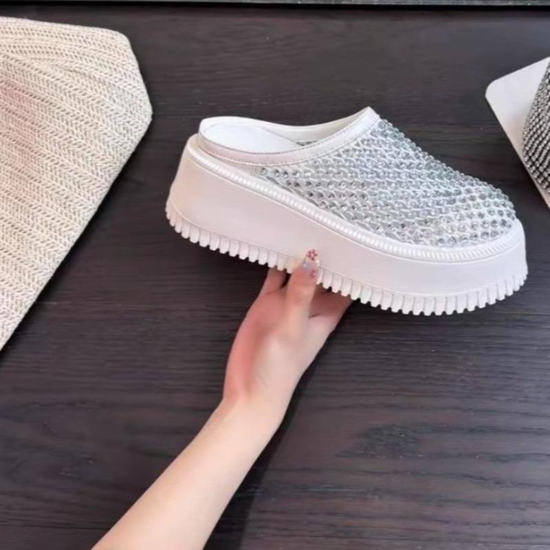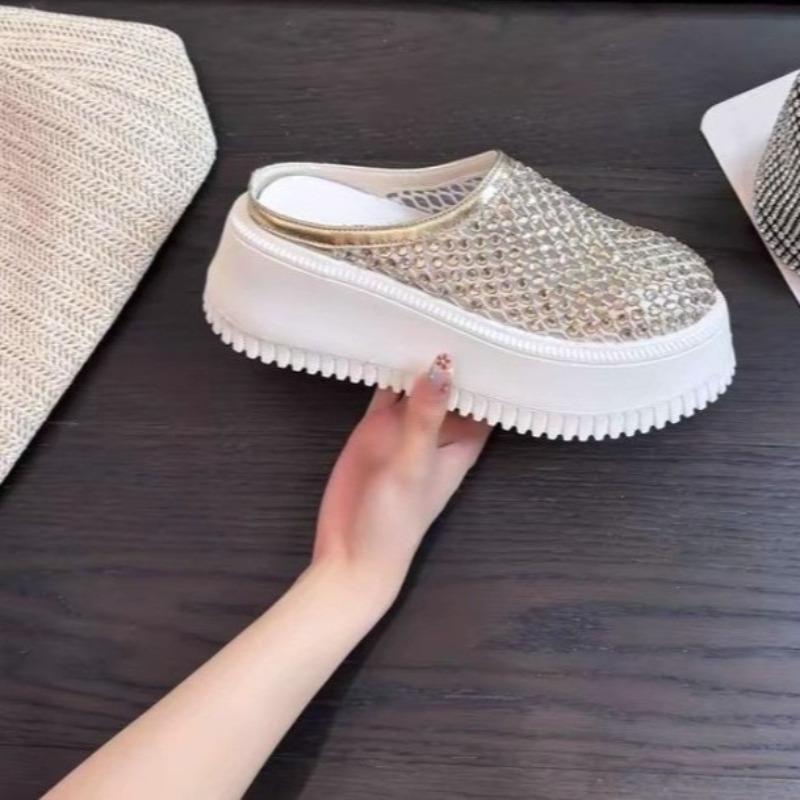 Босоножки на высокой платформе Летние Новые Круглый носок Глубокие Слипоны Стразы Сетка Дышащие Универсальные Обернутая Голова Вьетнамки