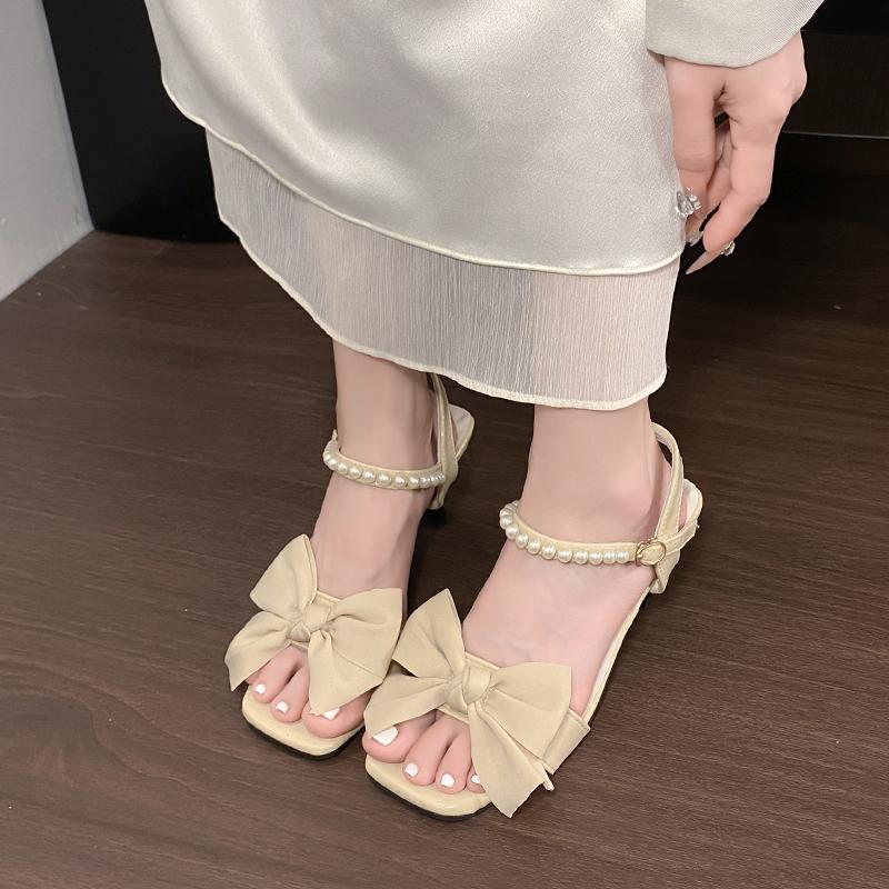 Летние туфли-босоножки с бантом и открытым носком, модные универсальные с жемчугом, на одном ремешке, на квадратном каблуке, женские, с квадратным носком, нескользящие сандалии