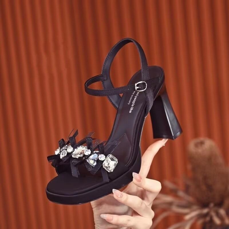 Сандалии на ремешке женские летние новые с квадратным носком открытым носком стразы с юбкой на платформе нескользящие на квадратном каблуке на высоком каблуке