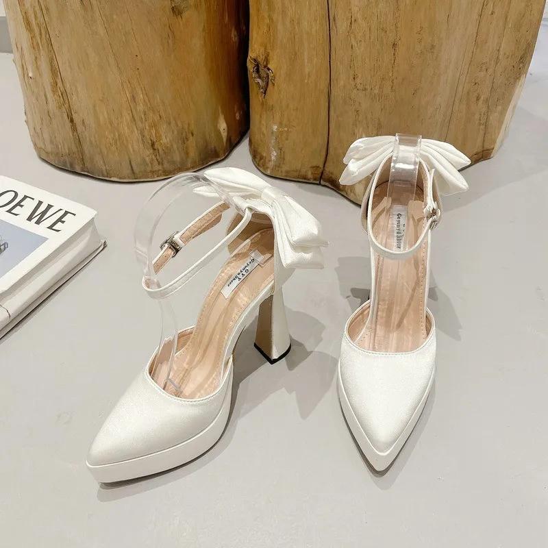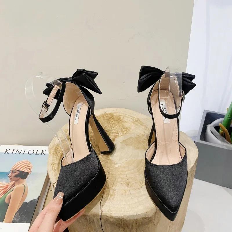 2025 Лето Новая Мода Сатиновые Босоножки на Высоком Каблуке Бант Пряжка на Одной Линии Острый Носок Толстый Каблук Женские Туфли Свадебная Обувь