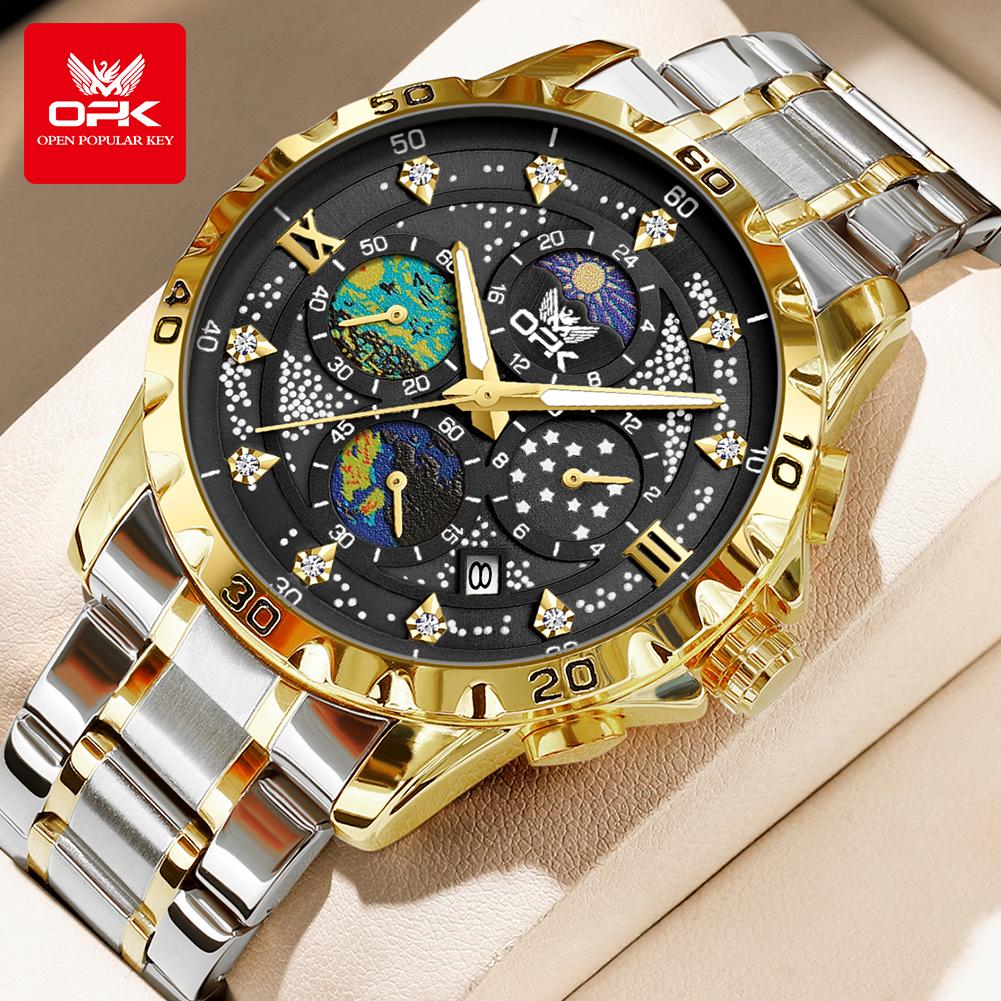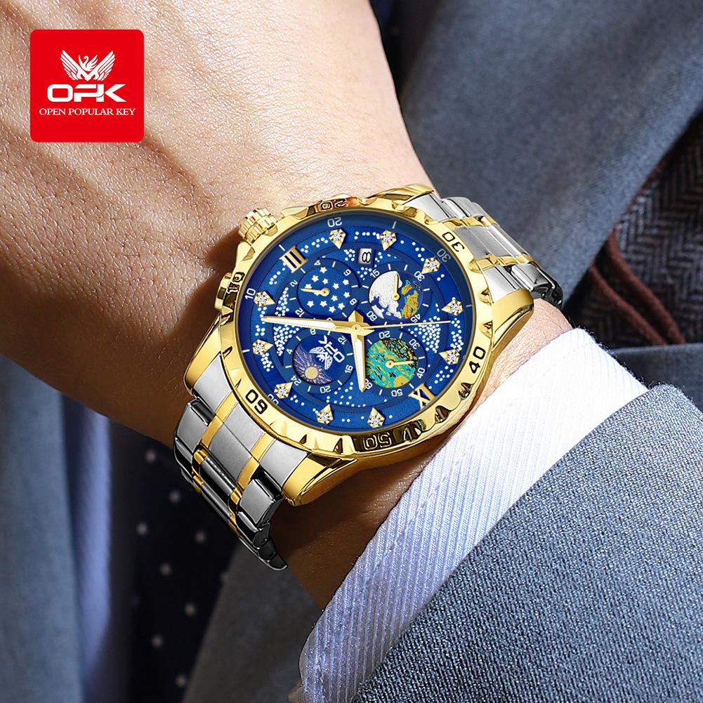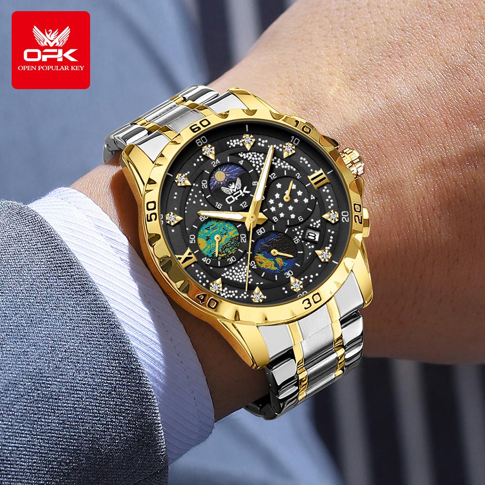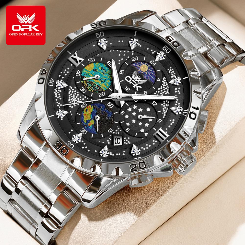 OPK Мужские часы с фазой Луны, многофункциональный хронограф, светящиеся водонепроницаемые часы из нержавеющей стали для мужчин