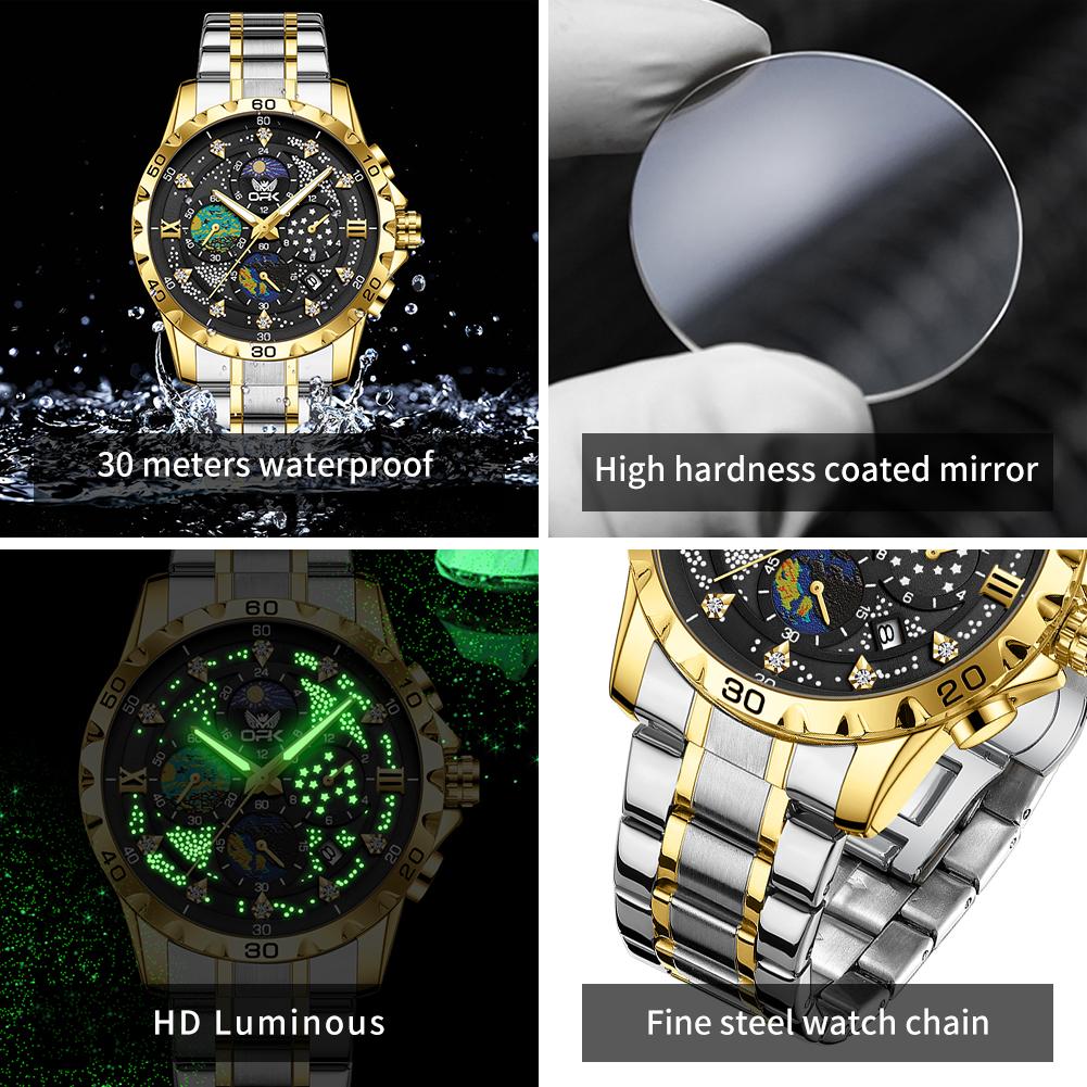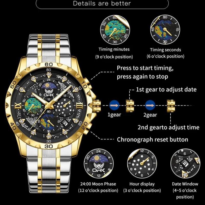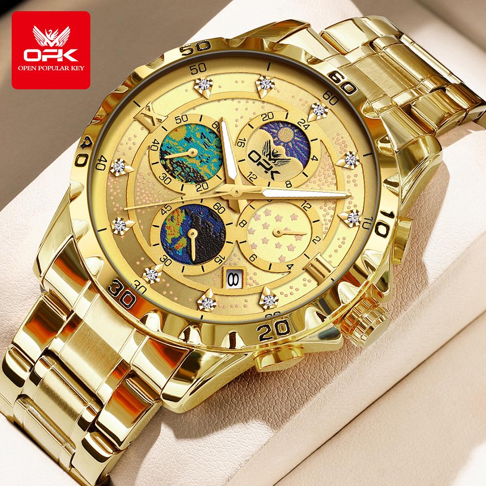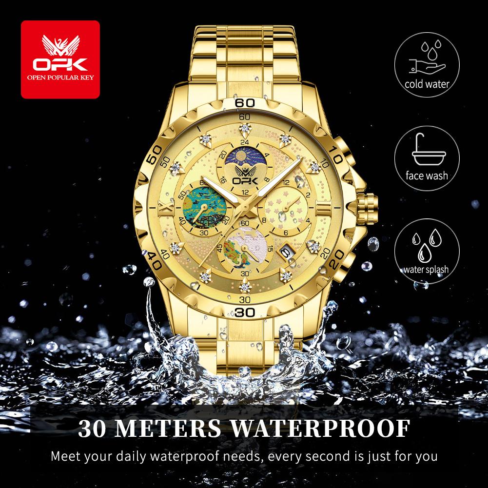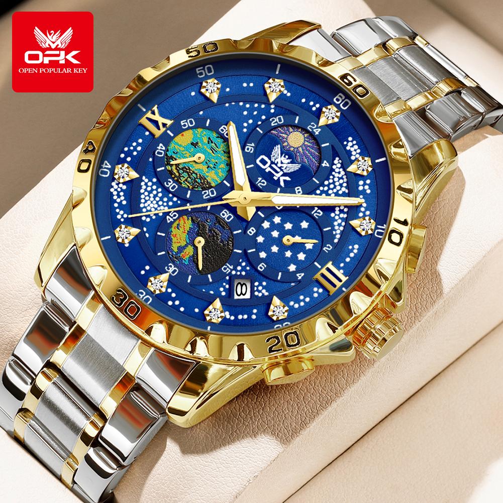 OPK Мужские часы с фазой Луны, многофункциональный хронограф, светящиеся водонепроницаемые часы из нержавеющей стали для мужчин