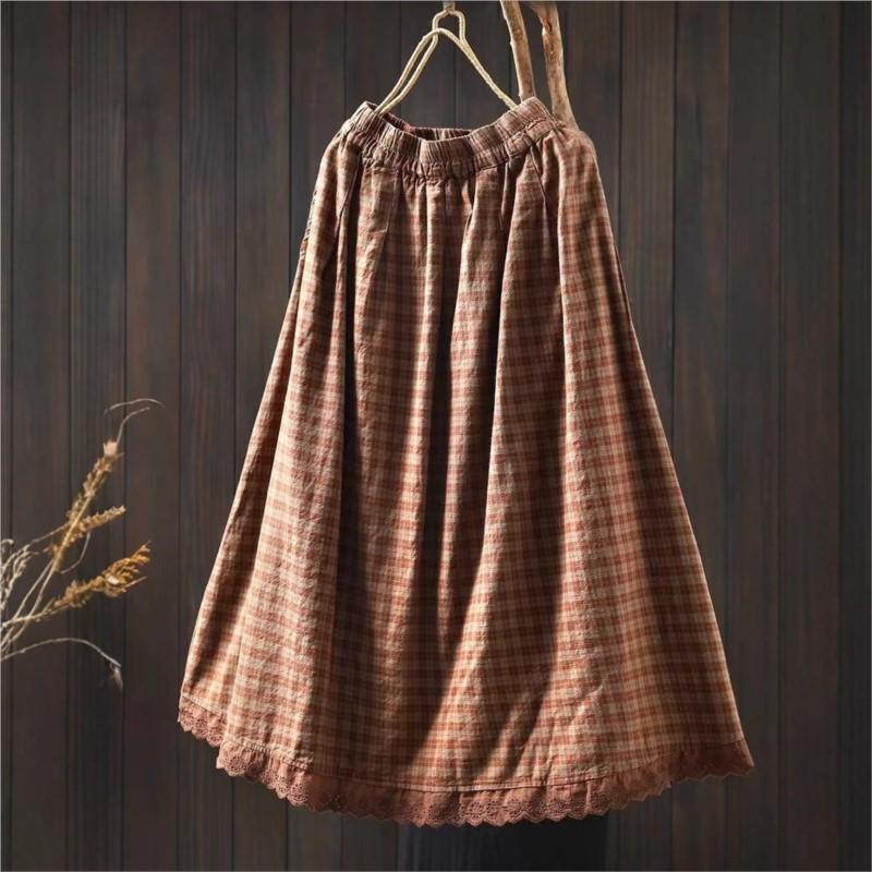 Johnature Женские клетчатые юбки Эластичная талия Пэчворк Кружево Летние Женские Повседневные Мягкие Юбки — купить товар онлайн с бесплатной доставкой по всему миру!