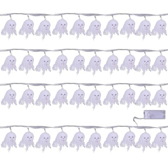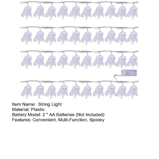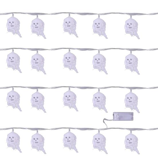 Украсьте ваши празднования Хэллоуина этими гирляндами в форме черепов! Питание от двух батареек типа АА (не включено), эти светильники универсальны для использования как в помещении, так и на улице.