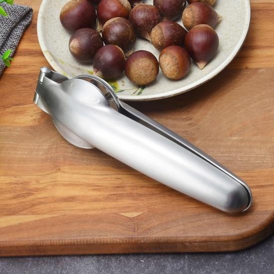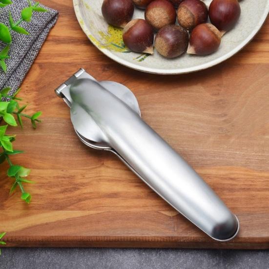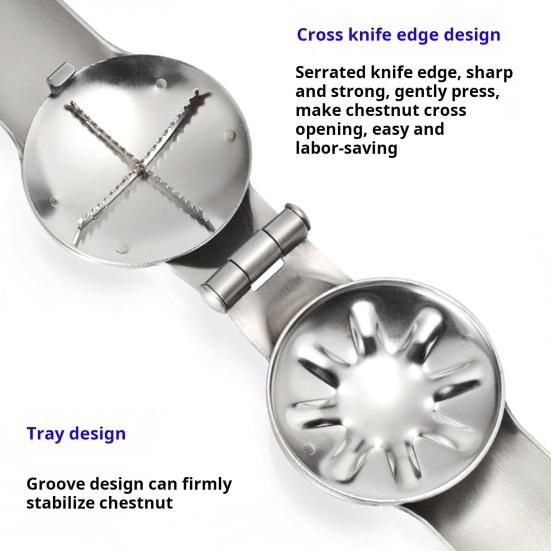 Универсальная функциональность: Этот многофункциональный инструмент, выполняющий функции щипцов для каштанов, резака, открывалки и овощечистки, предлагает комплексные возможности для работы с различными видами орехов.. Широкий спектр его применения включает стабилизацию таких продуктов, как каштаны или грецкие орехи, на круглом подносе для предотвращения скольжения во время использования.