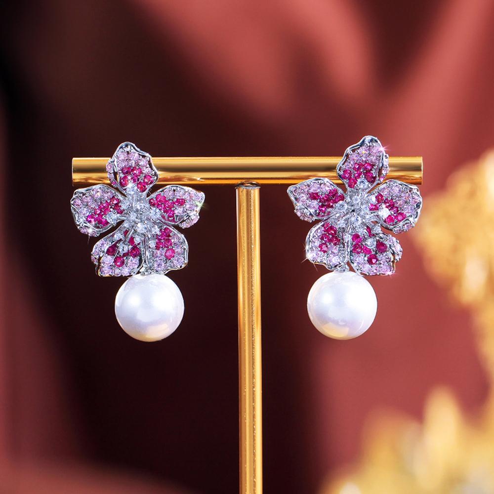 Изысканные серьги-подвески с цирконами, с кубическим цирконием нежного розово-красного цвета, в виде милого цветка и жемчуга, для женщин, шикарные украшения для свадебной вечеринки E1157 — купить товар онлайн с бесплатной доставкой по всему миру!