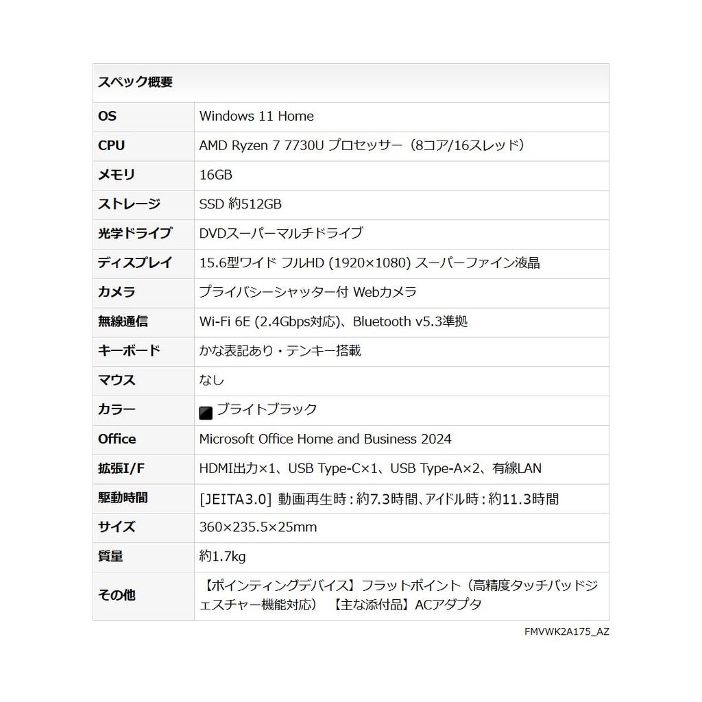 Fujitsu FMV Note A Ноутбук Office Windows AMD Ryzen 16 ГБ 512 ГБ Super Multi WA1-K2 (MS 2024, 11, 15,6-дюймовый, 7, ОЗУ, SSD, Диск) FMVWK2A175_AZ