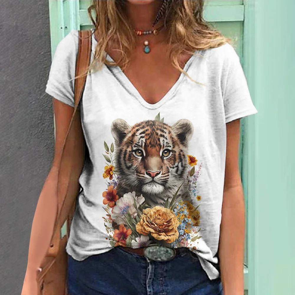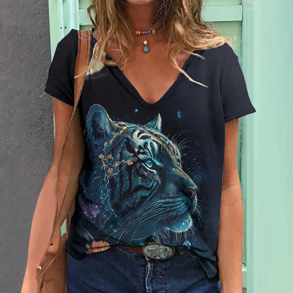 Футболки с тигровым принтом, 3D-принт с животными, женская футболка с коротким рукавом, V-образный вырез, уличная одежда, свободные женские футболки в стиле Харадзюку, топы, одежда