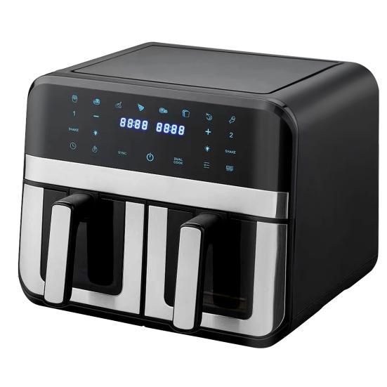 8 режимов приготовления: Готовьте разные типы продуктов в разных режимах приготовления, от рыбы, картофеля фри, бекона, выпечки, куриной голени, стейка, овощей, креветок до курицы. Благодаря умному напоминанию о встряхивании, двойная аэрофритюрница с горячим воздухом сообщает вам, когда пора перевернуть еду, чтобы обе стороны приготовились должным образом и на стол подавалась только вкусная еда.