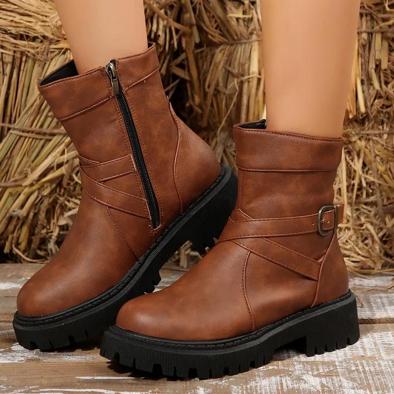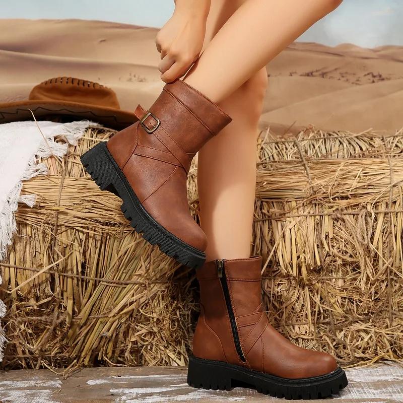 Модная обувь для женщин 2024 Высокое качество Боковая молния Женские ботинки Зима Круглый носок Однотонные Короткое голенище Платформа Массивный каблук Модные ботинки