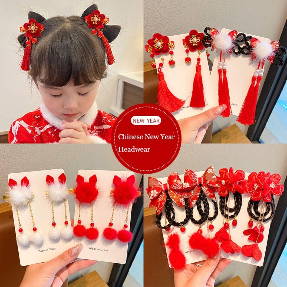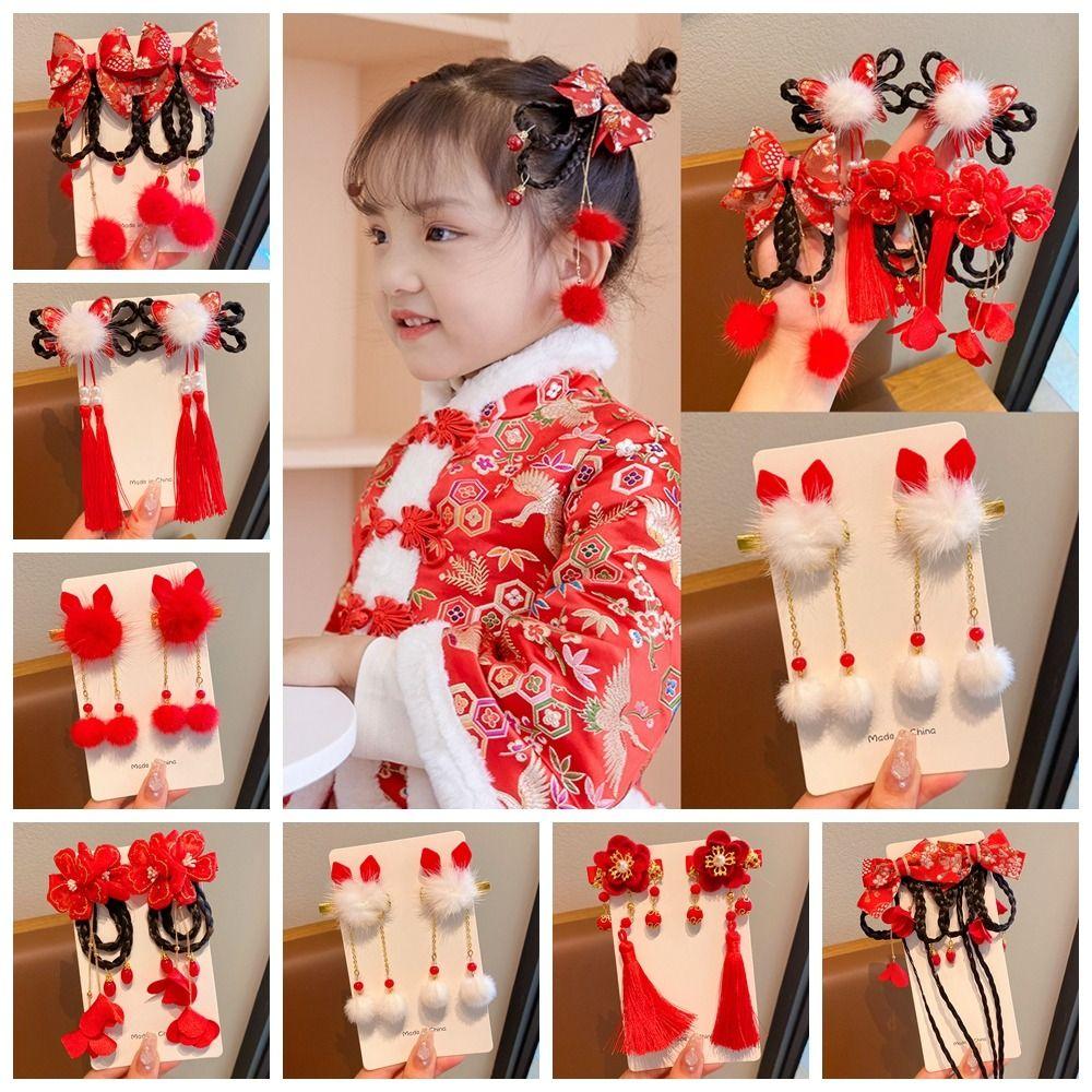 Tassel Children Wig Hairpin Flower Red Bow Hairpin Lovely Chinese New Year Headwear Baby