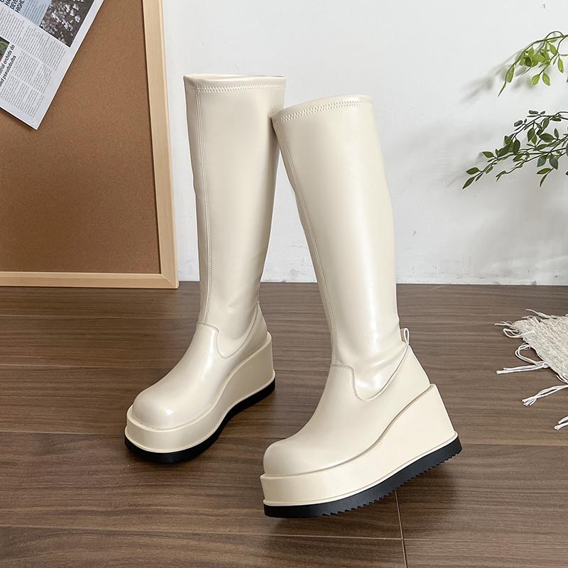 Панк Стиль Платформа Клиновидный Каблук Женские Сапоги до Колена Мода Слипоны Увеличение Роста Женские Ботильоны Рыцаря