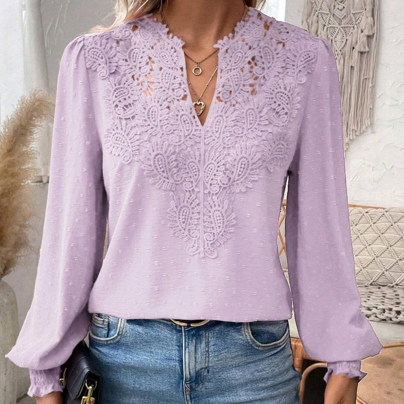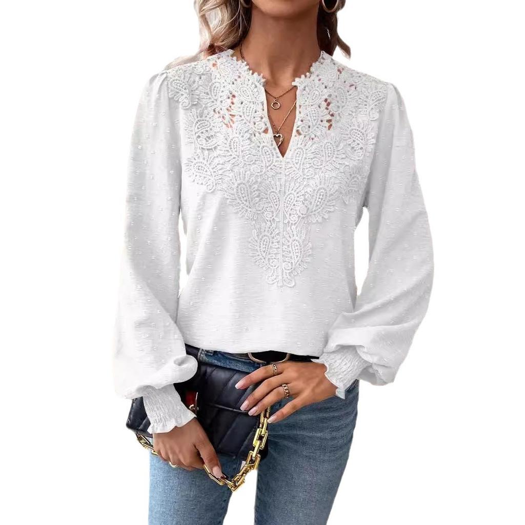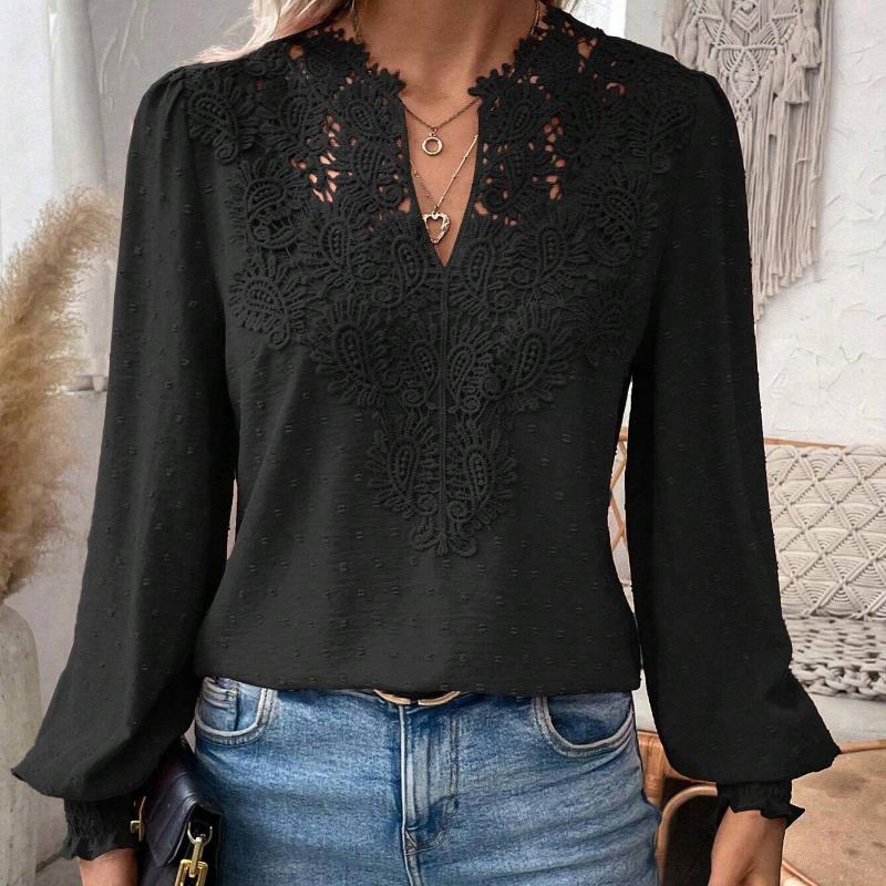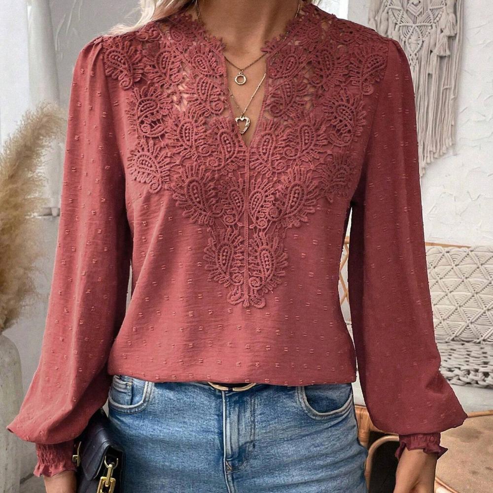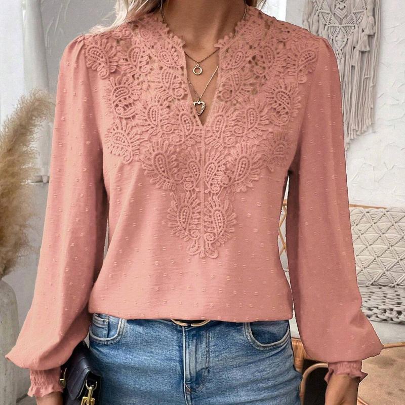 Новая коллекция Осень/Зима 2025, Модный V-образный вырез, Кружево, Однотонный, Длинный рукав, Повседневный топ, Женский топ, Осень/Зима, Элегантный дизайн