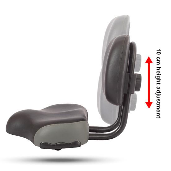 Регулируемый комфорт: Высоту спинки можно настроить в соответствии с потребностями различных пользователей, а большая система регулировки с помощью ручки обеспечивает надежное позиционирование, обеспечивая индивидуальный комфорт и поддержку во время длительного процесса езды на велосипеде.