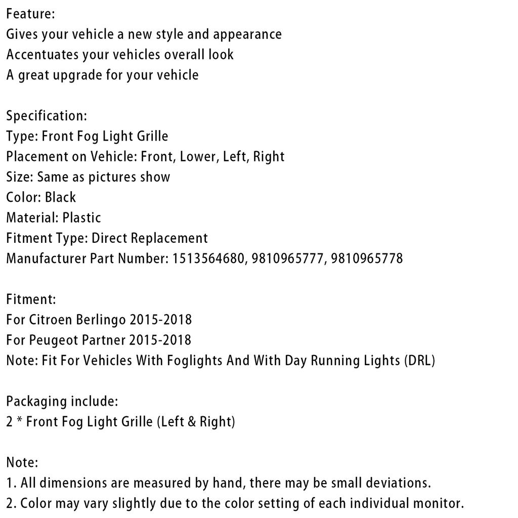 Решетка противотуманной фары переднего бампера подходит для Citroen Berlingo подходит для Peugeot Partner 2015-18