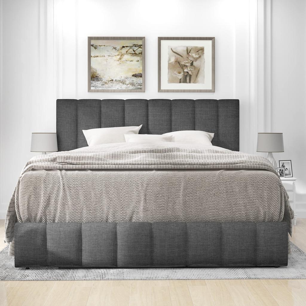 Designer Polsterbett, Leinenmaterial, hydraulisches Boxspringbett, Lattenrost, Stauraum, Holzfuß schwarz, Grau 140x200 cm