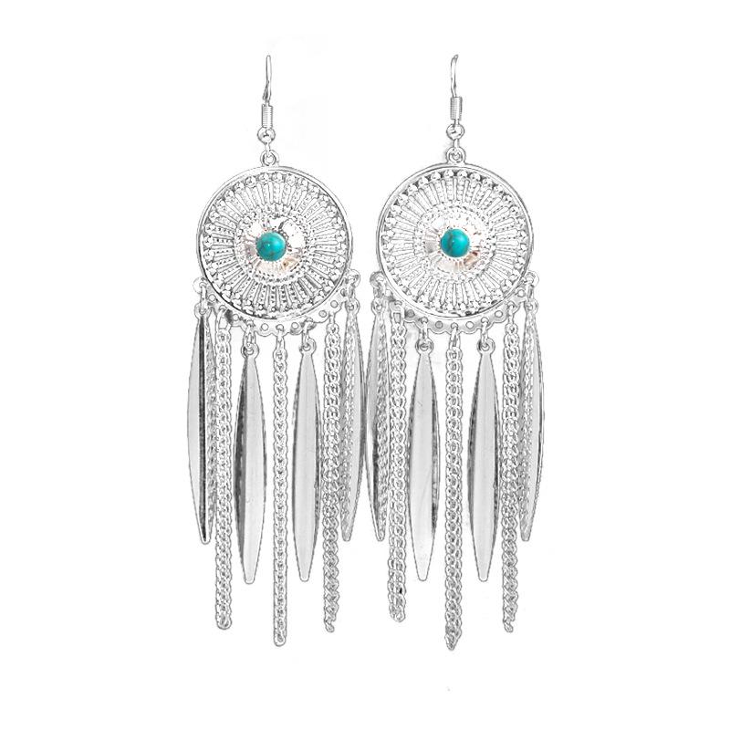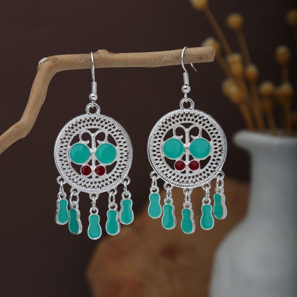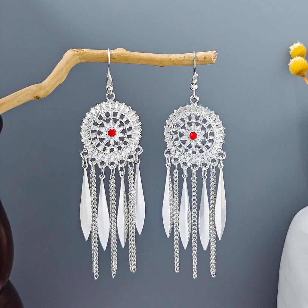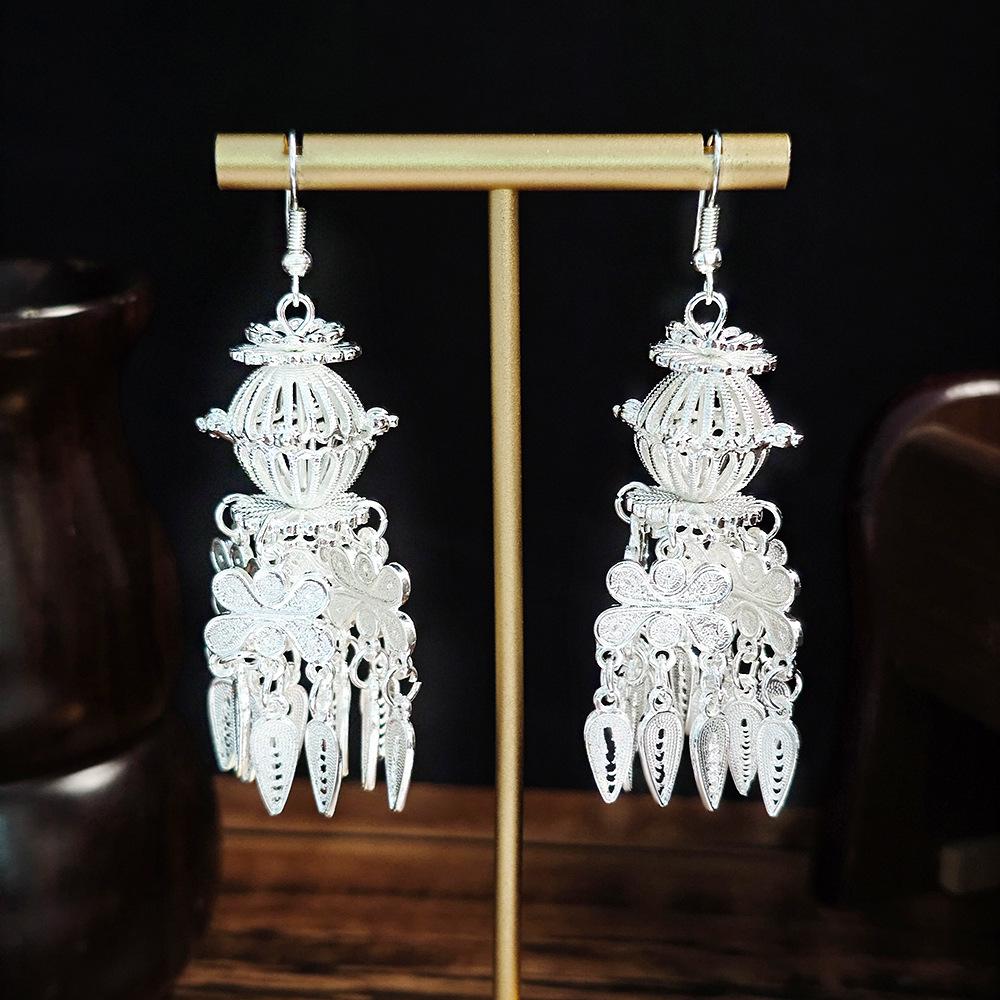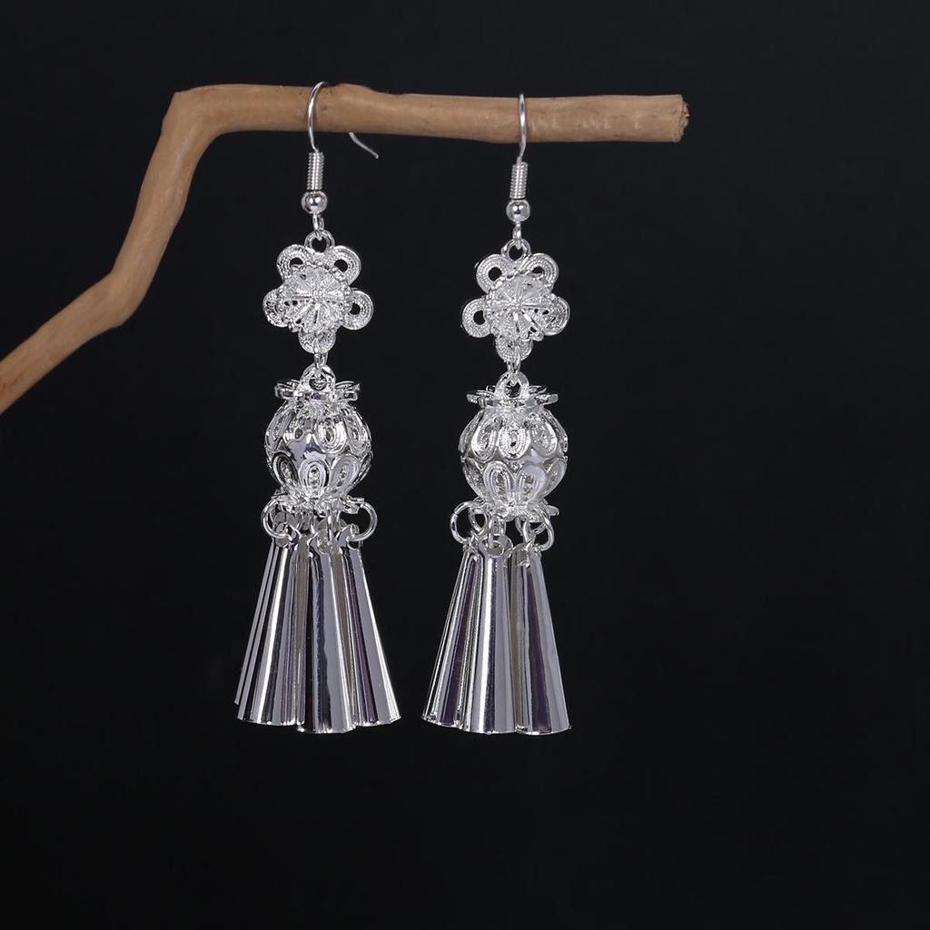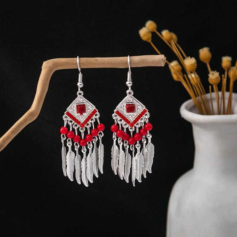 Этнические серьги-подвески с кисточками из перьев - Имитация серебра Мяо, Популярный туристический товар, Милый дизайн с бобами.