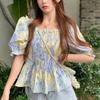 Сломанная блузка французский стиль рукав-буф фонарик лето новая милая вырез лодочкой стильная сборка приталенная винтажная рубашка