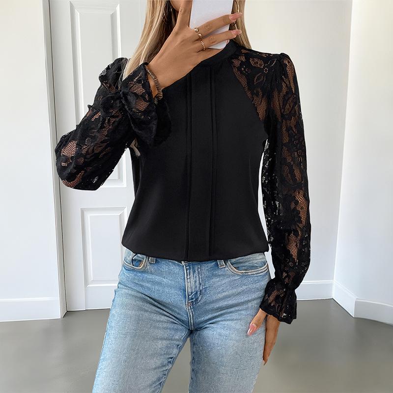 2025 Новая осенняя универсальная сексуальная и элегантная женская рубашка с полувысоким воротником, однотонная, с кружевом, с длинным рукавом