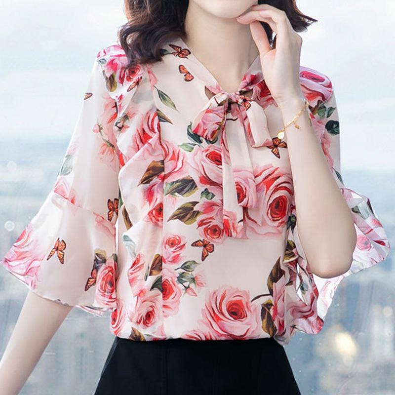 Элегантная модная шифоновая рубашка с цветочным принтом и бантом на кулиске, лето 2023, с V-образным вырезом и рукавом три четверти, приталенная блузка, женская одежда