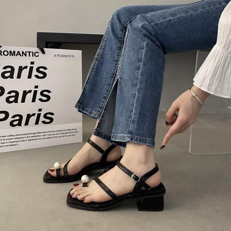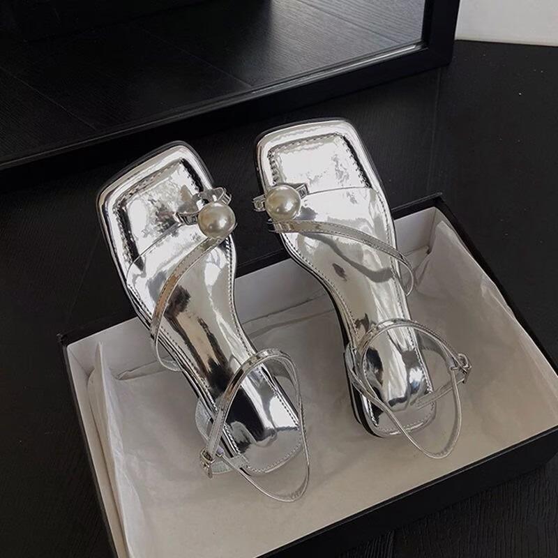 2024 Новые женские сандалии с квадратным носком на низком каблуке, удобные повседневные женские сандалии с открытым носком и жемчужной пряжкой