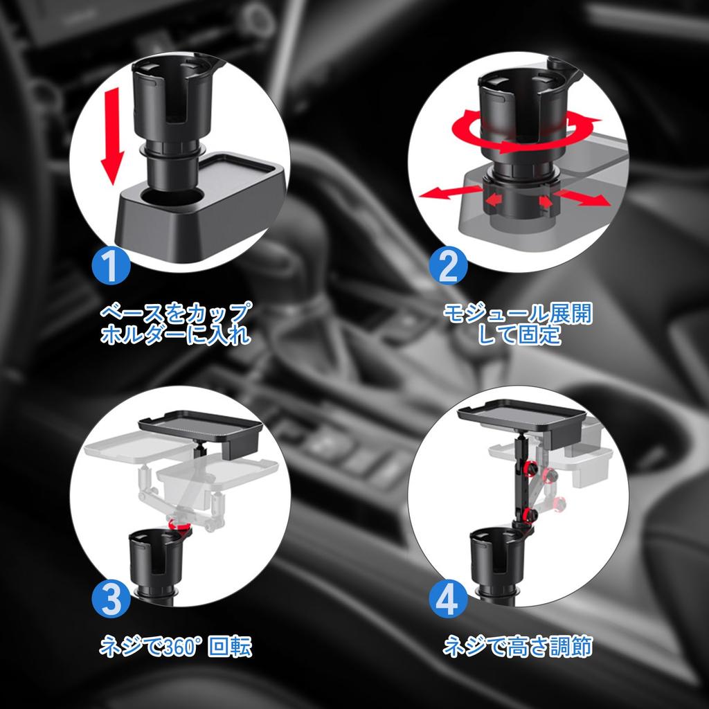 [Включает поднос] Этот автомобильный держатель для напитков с подносом предлагает больше места для хранения, чем обычные продукты, позволяя хранить не только стаканы, но и еду, напитки, смартфоны и другие мелкие предметы, экономя место в салоне вашего автомобиля. [Высокая стабильность] Основание держателя для напитков регулируется, что делает его идеально совместимым с круглыми автомобильными подстаканниками. Подстаканник оснащен встроенной эластичной пряжкой и четырехзубчатой конструкцией, которая предотвращает столкновение чашек и предохраняет их от повреждений.. Он тихий и бесшумный. Он стабилизирует ваш напиток и предотвращает проливание. [Простая установка] Просто вставьте этот держатель для напитков в круглый подстаканник вашего автомобиля и поверните основание, чтобы зафиксировать его на месте. Высоту подноса также можно отрегулировать по вашему желанию.. Подстаканник имеет прорезь для удобного держания и размещения стаканов, даже кружек.. [Многофункциональный] Поднос может вращаться на 360°, что делает его удобным не только для напитков, но и для использования в качестве столика для обеда в машине, если это срочно необходимо.. Лоток также оснащен отделением для хранения смартфона, позволяющим хранить мелкие предметы, такие как смартфоны и карты, поддерживая порядок в салоне вашего автомобиля.. [Высокопрактичный] Высокая термостойкость и устойчивость к внешним воздействиям